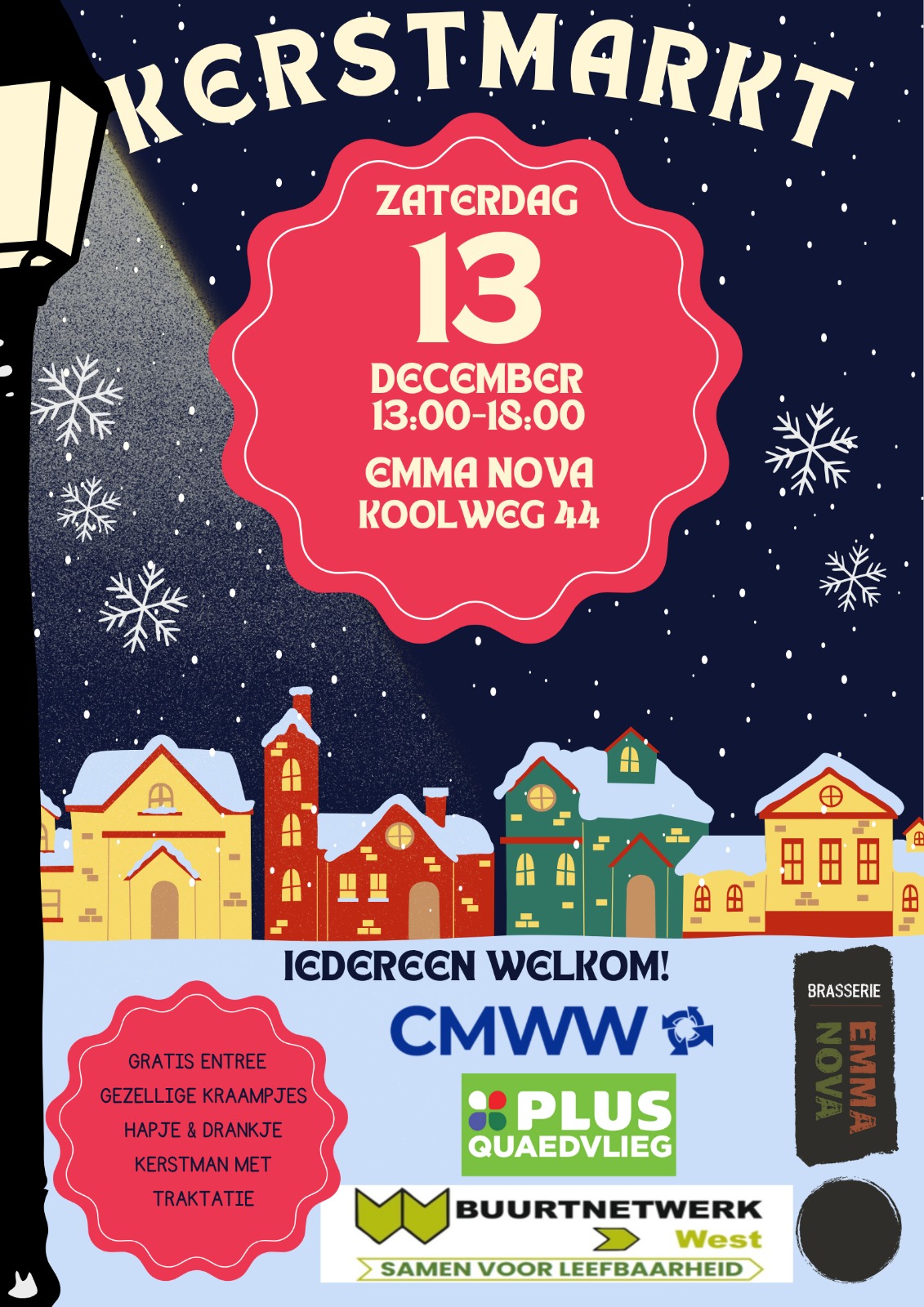 Op 13 december hebben we een kerstmarktje op het Orionplein in samenwerking met CMWW, Plus-markt en brasserie Emma Nova. Er zijn kerstkraampjes, gratis glühwein, chocomel, hapjes, een kerststal en de kerstman trakteert de kinderen.